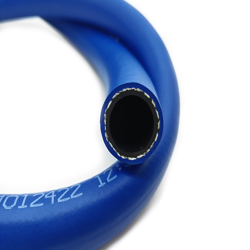 增強層:一層高強度合成纖(xiān)維(wéi)編織層,特殊的編織角度(dù)使得軟管具備高耐曲繞性,並(bìng)對接頭有較強的抱緊度(dù),不必再使用卡箍緊固(gù)。